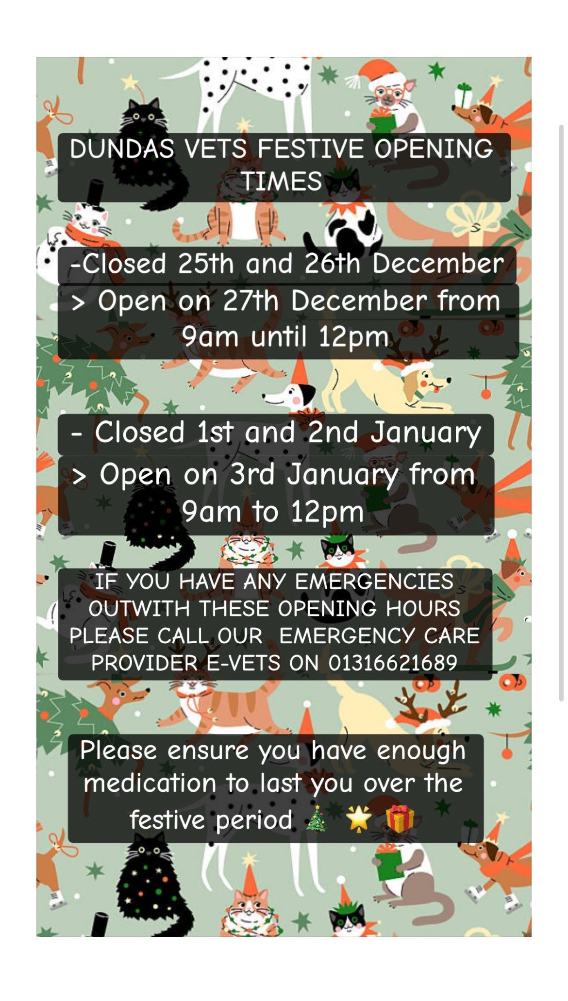 IF YOU HAVE ANY EMERGENCIES WITHIN THESE OPENING HOURS PLEASE CALL OUR EMERGENCY CARE PROVIDER E-VETS ON: 01316621689